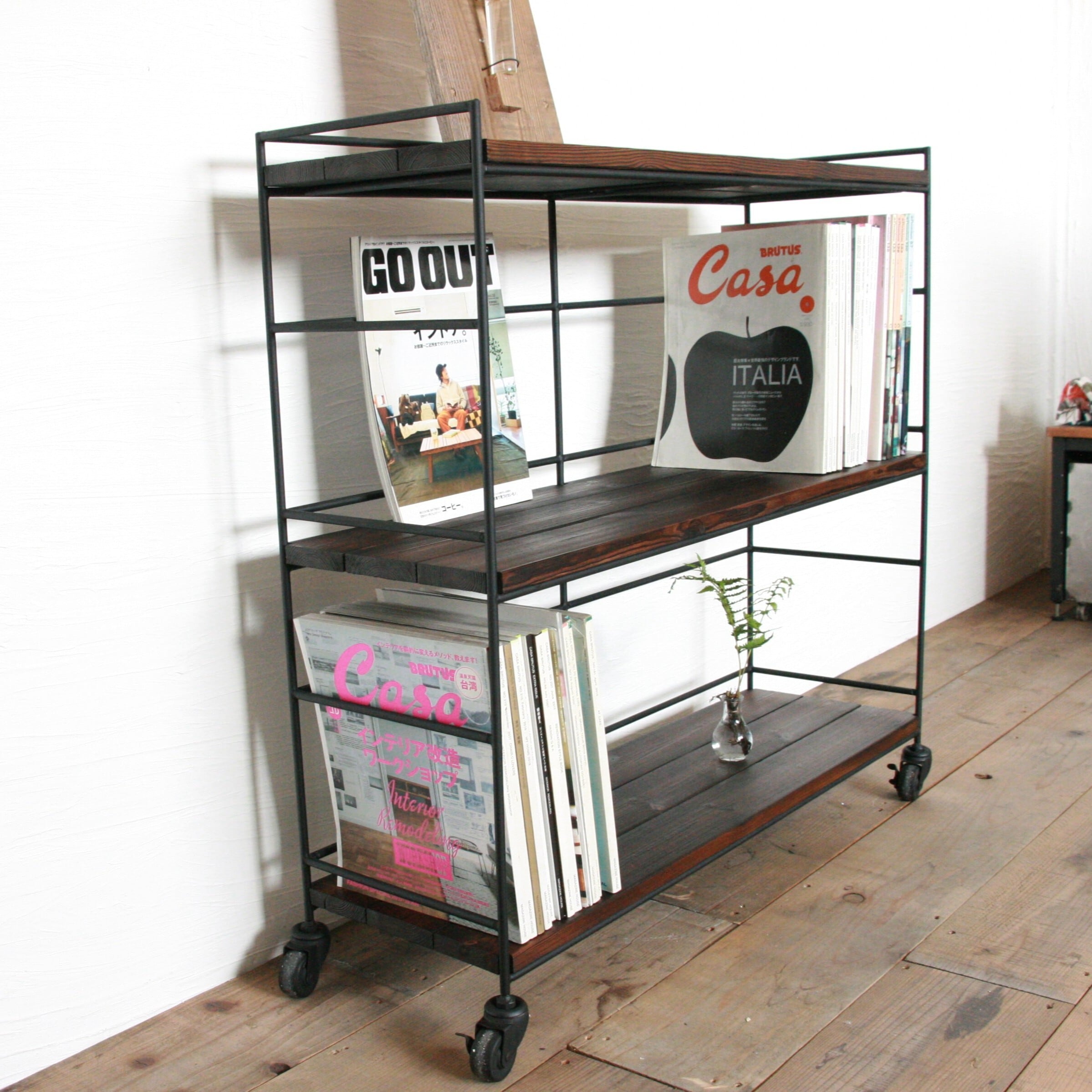 キャスターが付いたアイアンフレームのシェルフ