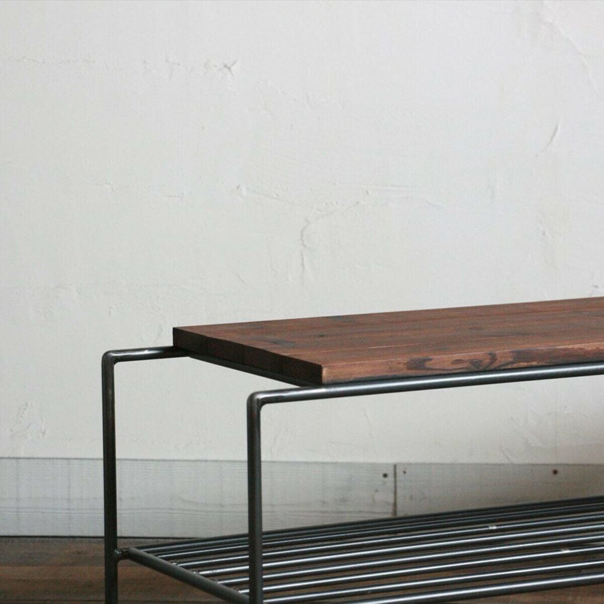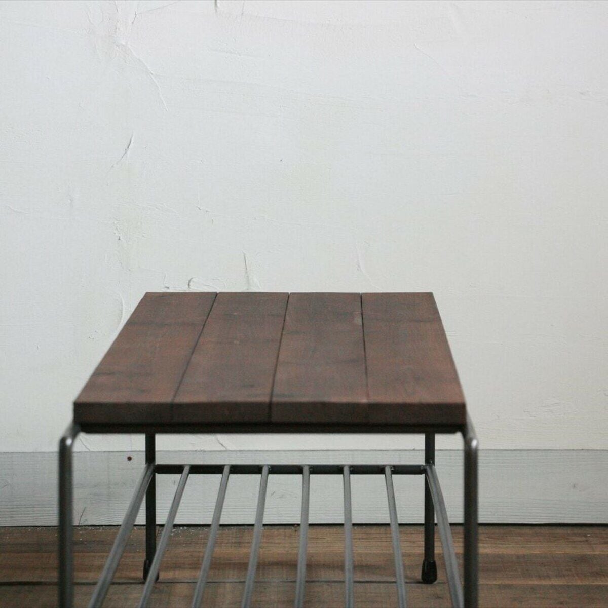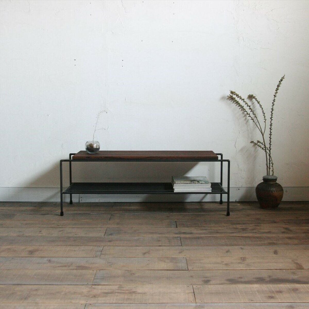 木目の美しいウッドトップに、脚部は味わいのあるアイアンワークのローボード